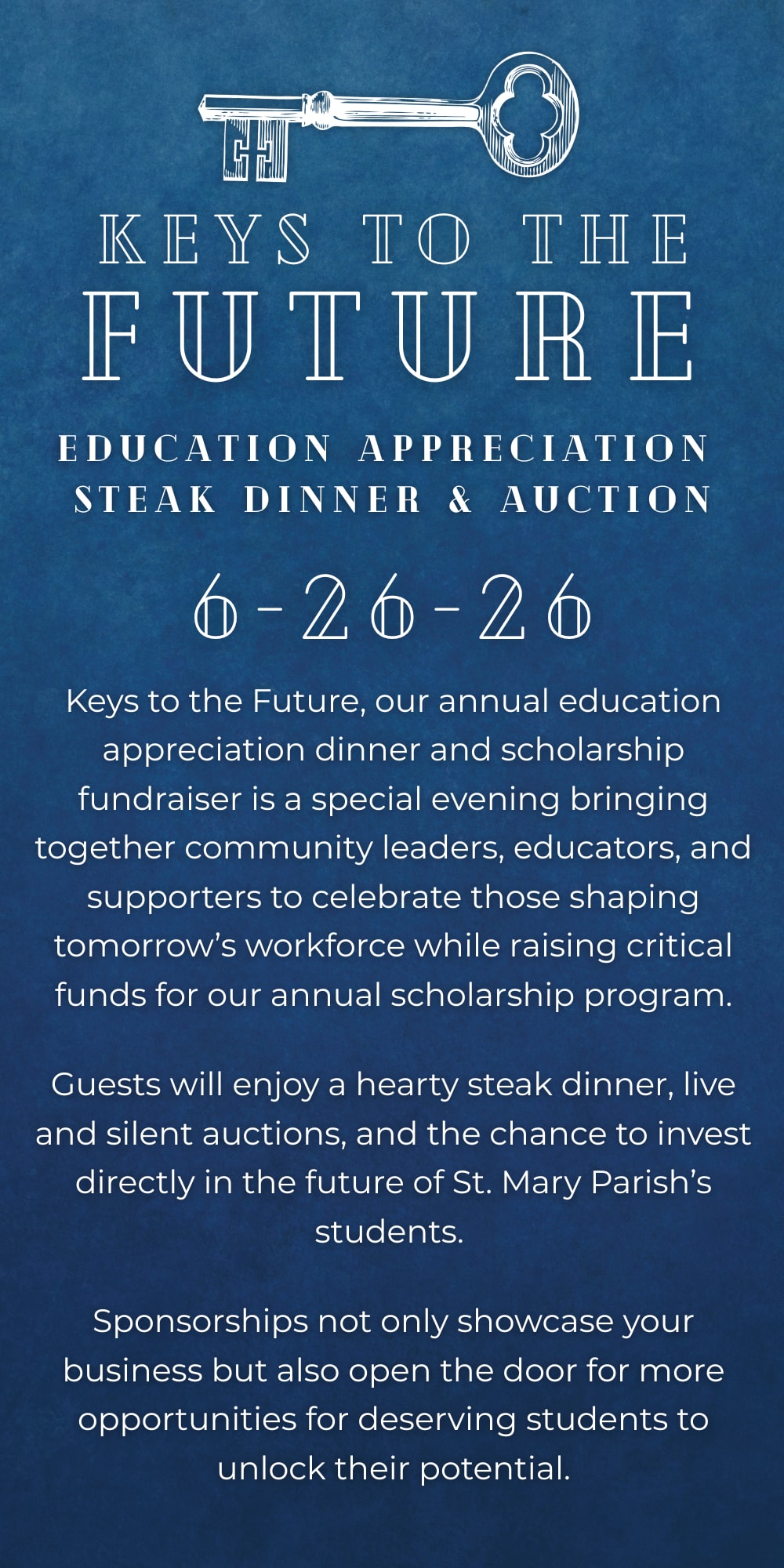 Keys to the Future, our annual education appreciation dinner and scholarship fundraiser is a special evening bringing together community leaders, educators, and supporters to celebrate those shaping tomorrow’s workforce while raising critical funds for our annual scholarship program. Guests will enjoy a hearty steak dinner, live and silent auctions, and the chance to invest directly in the future of St. Mary Parish’s students.